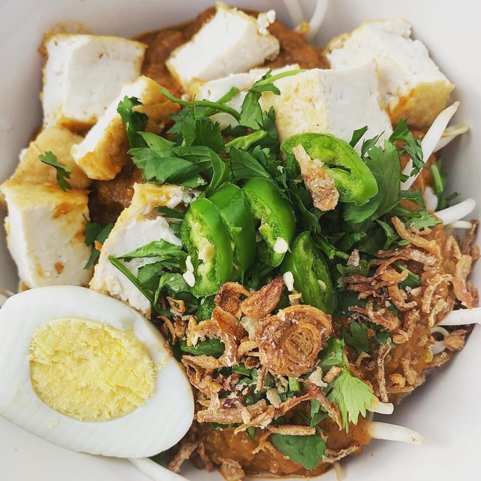 MEE REBUS – $14.50Thick sweet potato based beef broth with curry-ish flavor, over egg noodle, topped with cilantro, fried shallots, egg, jalapenos, sprouts and tofu. Note: contains dried shrimp