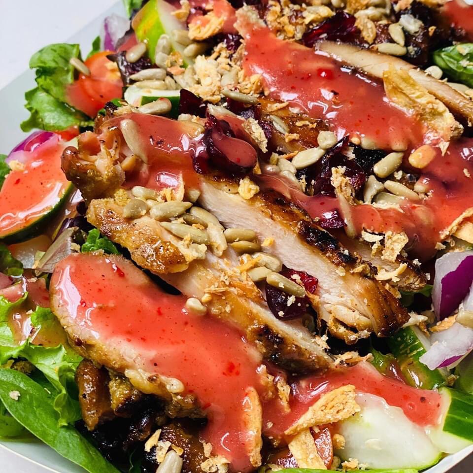 24 hour satay marinated chicken thighs, grilled with love, over mixed greens, cherry tomatoes, crushed peanuts and fried onions, with salad dressing.