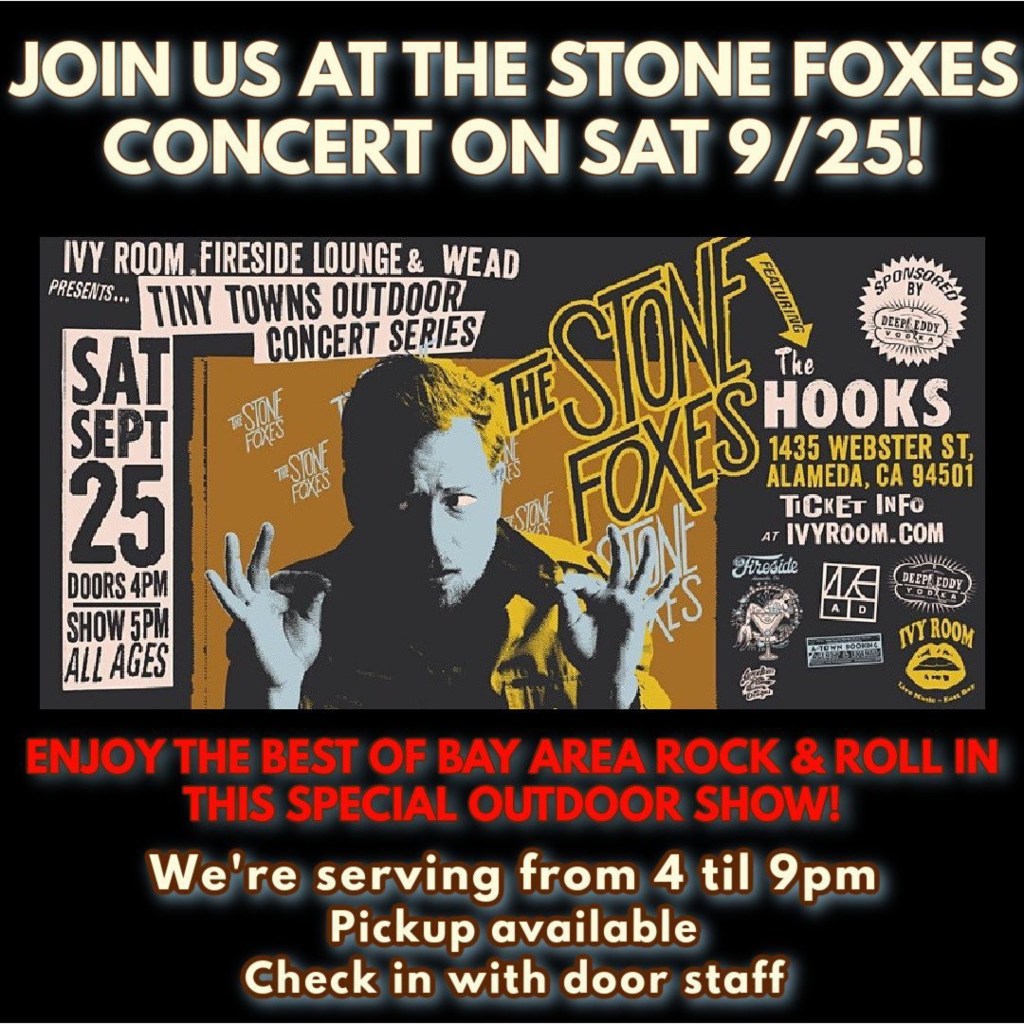 SAT – Al Fresco Dining Park (Corner of Webster & Taylor). @thestonerosesofficial are playing a special outdoor show! This is a ticketed event. Please come and support live music. But, if you’d like to just grab some food to go, check in with door staff and they’ll send you over to us. 4-9pm