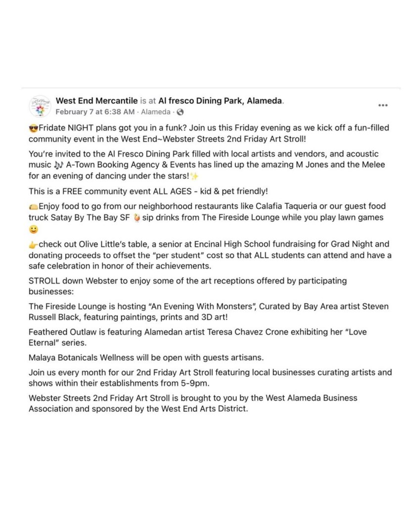 Next up…See you Friday evening at @2ndfridayartstrollalameda! Stroll down Webster Street in Alameda’s vibrant West End Arts District for an evening filled with fine art, food & beverages.