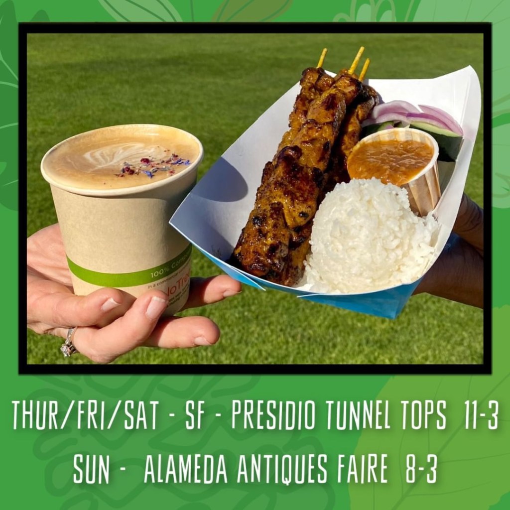 We’ll be at Presidio Tunnel Tops [@presidiosf] three days this week – Thursday, Friday, and Saturday. Grab a fresh cup of coffee from California Kahve [@california.kahve] (Thu/Sat only), then visit us for satay hot off the grill, then kick back and enjoy the stunning views of the San Francisco Bay, Golden Gate Bridge, Alcatraz, and more.