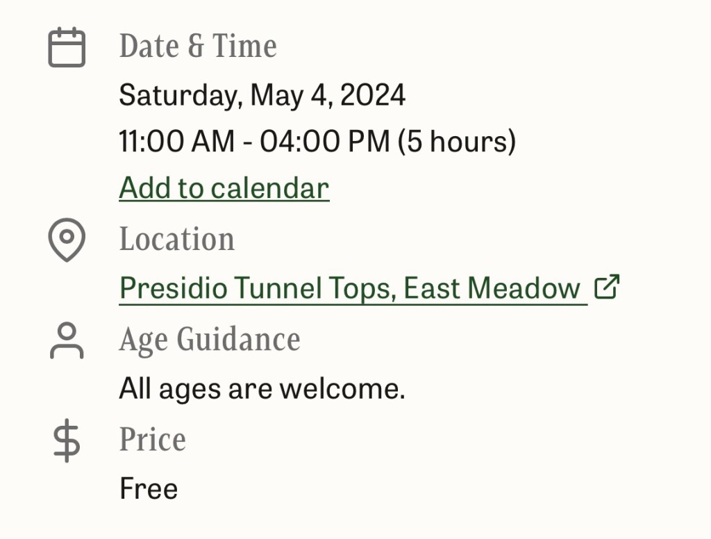 SATURDAY – SATAY BY THE BAY SF @ PRESIDIO TUNNEL TOPS [@presidiosf] 11-4:30