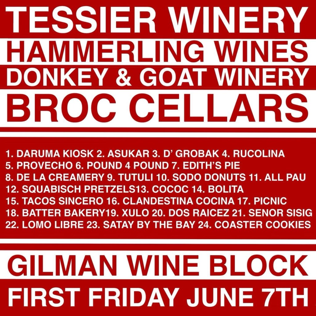 First Fridays June 7th @gilmanwineblock with @tessierwinery @broccellars @hammerlingwines @donkeyandgoat @allpauberkeley @pro_ve_cho @senorsisig @lomolibre @clandestina.cocina @coastercookies @sododonuts @pound4poundgrilledburgers @daruma.kiosk @palestinian_cuban_fusion @dgrobak.bayarea @rucolinadining @edithspieoakland @delacreamery @tutuli.coyotas @squabisch @bolitamasa @picnicrotisserie @tacossincero @sataybythebaysf @batter